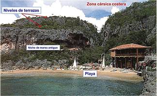 La abrasión costera en Santiago de Cuba, y a partir de la condición de una plataforma submarina poco desarrollada, propicia la formación de playas de arenas gruesas y guijarros redondeados compuestos por rocas vulcanógenas y vulcanosedimentarias típicas en la región, aunque en algunos casos se forman de arenas finas poco desarrolladas provenientes de las formaciones calcáreas cuaternarias, que cerca de la costa se encuentran generalmente carsificadas. Por otro lado, en las costas de la provincia de Santiago de Cuba se desarrollan distintos niveles de terrazas costeras de material calizo y margoso calizo, sobre todo en el municipio Santiago de Cuba, en ellas se ubican distintas infraestructuras que actualmente se encuentran amenazadas por fenómenos erosivos (Fig. 19).