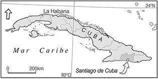 La Provincia Santiago de Cuba se encuentra situada al sur de la región oriental de Cuba, entre los 19°53’, 20°12’ de latitud norte y los 75°22’, 77°02’ de longitud oeste, limitando al oeste con la provincia Granma, al norte con la provincia Holguín, al este con la provincia Guantánamo y al sur con el Mar Caribe (Fig. 2). Su capital es la ciudad de Santiago de Cuba, segunda urbe más poblada del país (más de 520 000 habitantes). [17]