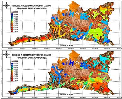 Los valores obtenidos de susceptibilidad ante deslizamientos particularmente para la ciudad de Santiago de Cuba ante los deslizamientos, van de baja a media. Las zonas con peligros potenciales y con observaciones efectivas se encuentran en el borde este de la bahía a lo largo de la Carretera Turística desde Altamira hasta Punta Gorda. Se incluyen las laderas de las elevaciones en la zona de Chicharrones, distritos Antonio Maceo y José Martí (al norte de Micro 7), así como el Abel Santamaría, Quintero y en la Autopista [10]. Estudios realizados por otros autores ratifican a las zonas montañosas de los municipios Guama, Santiago de Cuba, II Frente y III Frente como los de mayor peligro ante deslizamientos, se consideran como medios en zonas montañosas de San Luis, Palma Soriano y Songo- La Maya, y de bajos para el resto de la provincia (Fig. 21) [12,23].