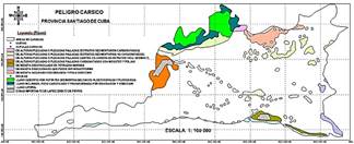 Las principales afectaciones por peligro cársico en la región suroriental del país, y consecuentemente en la provincia Santiago de Cuba, se encuentran en las zonas cercanas a las costas donde se genera una alta infiltración al manto freático, formación de cavidades y por tanto, daños a distintas infraestructuras; propiciando además, algunos asentamientos diferenciales en determinadas áreas. Otras manifestaciones pueden relacionarse con el derrumbe de algunas paredes de formaciones cársicas que se encuentran cercanas a las costas formando terrazas en la cuenca Santiago y el área de Baconao, donde se han ubicado varias construcciones y obras de infraestructura (entre ellas varios hoteles: Costa Morena, Bucanero y Balcón del Caribe). [1]