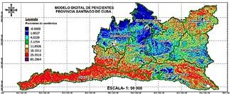 En las zonas montañosas, principalmente, de los municipios Guamá, la parte sur de III Frente y hacia el este del municipio Santiago de Cuba, las pendientes que sobrepasan el 50%, aspecto que favorece los fenómenos erosivos y de deslizamientos de tierra (Fig. 5). Solamente el 3% de la superficie total de la provincia está por debajo de la cota de 100 metros de altitud. La cuenca de Santiago de Cuba se enmarca como principal accidente hacia el centro sur de la provincia, donde se encuentran varios niveles de terrazas y mesetas escalonadas que parten desde la bahía de Santiago de Cuba (largo: 8.5km; ancho: 2.4km; profundidad: entre 8.8 y 13.7m) alrededor de la que se desarrolla la ciudad del mismo nombre, observando en su parte superior varias llanuras aluviales. [12]