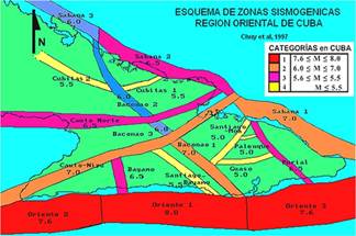 Desde el punto de vista sismotectónico la provincia Santiago de Cuba está situada al borde de los límites sur de la placa Norteamericana y norte de la placa Caribe, es interceptada por numerosas estructuras tectónicas, varias de las cuales determinan los límites de bloques con diferente dinámica en las zonas sismogénicas de la región oriental del país. En particular, se destaca el tipo de sismicidad conocida como de entre placas, vinculada a la estructura Bartlett-Caimán (zona sismogénica oriente) la cual se caracteriza por ser un sistema de fallas transformantes abierto con una fosa en su centro (Fig. 8).