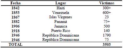 El peligro de afectaciones por tsunamis en la región del Caribe es bajo, con reportes de alturas de olas de hasta 6m, sin embargo, por esta causa han perecido más de 3503 personas entre 1842 y 1946 (Tabla 1) [18].