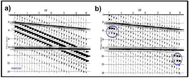 Comme nous l’avons souligné auparavant, une importante partie du ground roll affectant la section sismique synthétique est atténuée par le filtre SWNA (Fig. 1.b). Cependant, la connaissance préalable des paramètres du bruit (vitesses et fréquences), une partie du bruit résiduel, en cercle bleue, n’a pas été atténuée mais la qualité du document final reste acceptable.