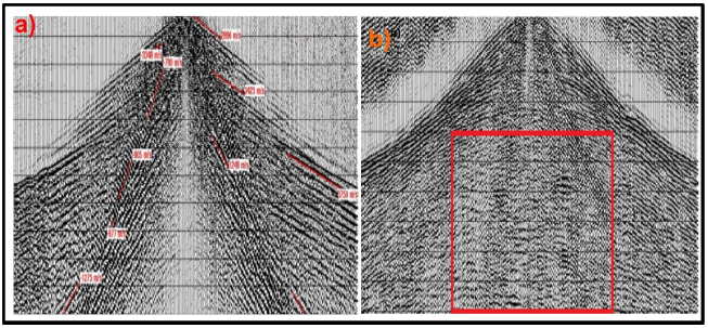 Pour un choix optimal des paramètres du filtre SWNA, nous avons identifié le ground roll sur un tir sismique brut (Fig. 2.a) en mesurant les différentes vitesses correspondantes. La gamme fréquentielle du ground roll est obtenue dans le domaine spectral par la transformée de Fourier bidimensionnelle après la mise à zéro (mute) des autres évènements sismiques dans le domaine temporel. La Fig. 2.b illustre le tir précédent, filtré par le filtre SWNA où nous constatons qu’une bonne partie du ground roll est filtrée (rectangle en rouge) laissant apparaître les hyperboles de réflexions d’une façon meilleure.