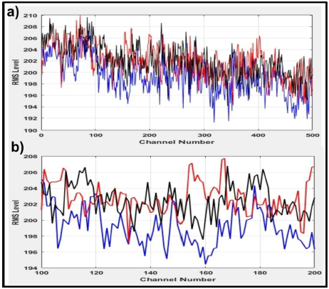 Cette métrique est souvent utilisée en traitement sismique de manière à comparer le niveau de bruit à l’intérieur d’une fenêtre temporelle. Les graphes de la figure 4.a montrent les niveaux RMS (RMS level) de la section sismique non filtrée (en rouge), insuffisamment filtrée (en noire), alors que le graphe en bleu représente le niveau RMS de la section sismique après l’application du filtre SWNA. Il est évident que le filtrage diminue le niveau RMS à cause de l’atténuation du niveau du bruit sismique présent dans la section. Un agrandissement entre les canaux 100 et 200 (Fig. 4.b) illustre d’une façon plus claire la différence entre le niveau RMS avant et après filtrage des ondes de surface.