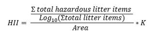 HII evaluates the relationship between hazardous litter items and Log10 of the total number of litter items found in the sampled area. K is a coefficient equal to 8, used to generate a better interpretation of the data. In terms of exposure to hazardous litter, the environmental quality of the ecosystem is classified into five classes that range from I ‘Safe site - no hazardous items’ to V ‘Extremely hazardous site - too many hazardous items.