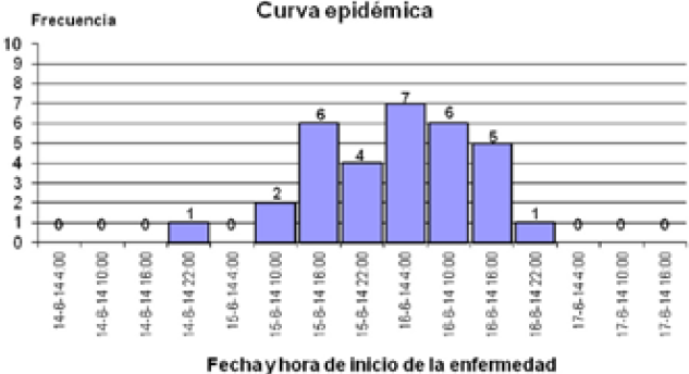 El análisis clínico-descriptivo se realizó en las personas que enfermaron, a través de la determinación de las características personales, sintomatología presentada, distribución temporal mediante la curva epidémica en función de la fecha de inicio de los síntomas, media y rango del período de incubación.