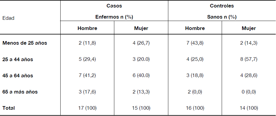 En las tres celebraciones participaron aproximadamente 204 personas, perteneciendo a la celebración A 114 personas, 60 a la B y 30 a la C. Se encuestaron 62 personas, de las que 32 resultaron afectadas (casos) y 30 sanas (controles). La tasa de ataque global aproximada fue de 51,6 %. Del total de encuestados un 53,2 % fueron varones. La edad media de los enfermos fue 44,2 años (DE: 21,2) y la de los sanos 35,3 años (DE: 18,12). La distribución de los participantes en función de la edad y sexos se muestra en la tabla 1.