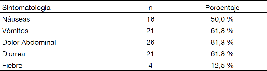 La curva epidémica (Figura 1) fue elaborada basandose en el periodo de incubación de la enfermedad y la distribución de casos cada 6 horas. La presentación del primer y último enfermo ocurrió a las 7 y 53 horas de la exposición, respectivamente. El tiempo medio de presentación de la enfermedad fue de 33 horas. Del total de enfermos, el 31,3 % recibió asistencia ambulatoria y no existieron hospitalizaciones ni defunciones. La sintomatología más frecuente fue el dolor abdominal en un 81,3 % de casos, seguida de los vómitos y diarreas que aparecieron en el 61 % de los afectados (Tabla 2).