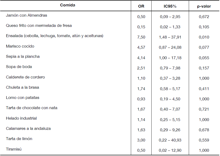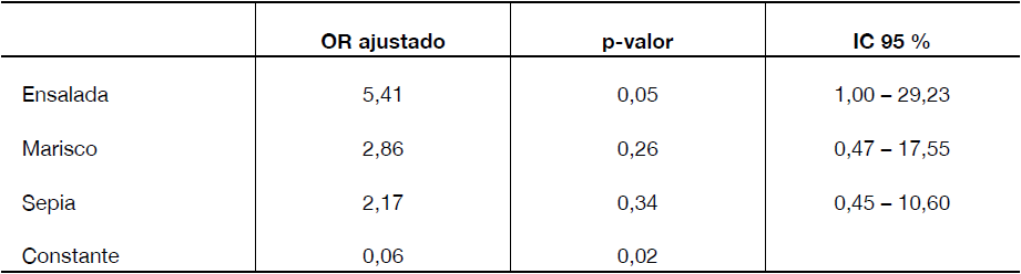 En el análisis multivariante se mantiene la asociación positiva y significativa con la ensalada, alejándose más la posibilidad de una asociación con el marisco y la sepia, a pesar de mantener OR mayores a 2.