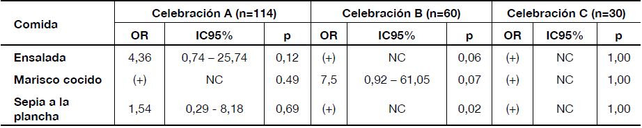 Al realizar el análisis por estratos, se tuvo en consideración diferenciar los alimentos con significación estadística por celebración y por alimentos asociados, a fin de valorar los posibles efectos de modificación o confusión. En el caso de la ensalada fue posible calcular la OR en la celebración A, mientras que en las otras al existir el valor “0” en el denominador el cálculo se hace infinito positivo, aunque con fines de riesgo se consideran como alimentos asociados positivamente porque la odds de exposición es positiva. El marisco cocido en la celebración B mostró un resultado próximo a la significación estadística (OR: 7,5; IC 95 %: 0,92-61,05). En el caso de la sepia la asociación es menos clara en la celebración donde fue posible el cálculo (Tabla 4).