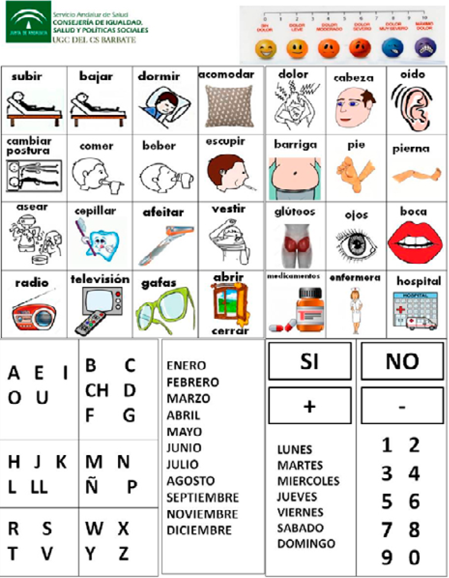 El pictograma contiene imágenes que hacen referencia a acciones o cosas que le puedan ser útiles a lo largo del día, como la escala del dolor, imágenes referentes a la acomodación, necesidades básicas, partes del cuerpo, el abecedario, números, afirmación, negación y otros.
