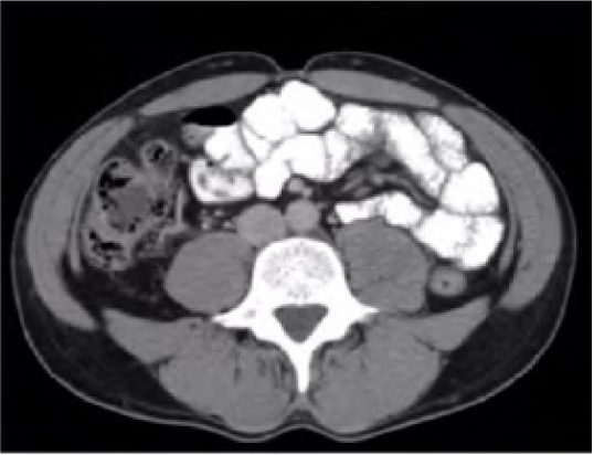 En el hemograma destacaba una linfocitosis del 56 % [25-35] con niveles absolutos de 4,4 x 10³/ mm³ [1,5-4x103] y VCM 79 fl [81-99]. La bioquímica objetivó niveles de ferritina de 18 ng/dl [12- 300], hierro de 26 µg/dl [50-200], albúmina de 3,4 g/dl [3,5-5,2], proteínas totales de 5,4 g/dl [6,5-8,2] y b2-microglobulina de 3,7 mg/l [1,06-2,22]. Los análisis de hormonas y marcadores tumorales, incluídos TSH, cortisol basal, alfafetoproteina, CEA, CA 19.9, PSA, enolasa neuronal y Cyfra 21.1 fueron normales. En la inmunología, ANAs, Anti LKM, Anti Músculo liso, Anti MPO, ECA y factor reumatoide fueron negativos. También lo fueron el ELISA para VIH y el PPD. La TAC toracoabdominal objetivó una lentificación del tránsito con dilatación y edema de asas de intestino delgado y múltiples adenopatías mesentéricas (figura 1). Los anticuerpos IgA antigliadina y antitransglutaminasa, recomendados en las principales guías de práctica clínica para el diagnóstico de la enfermedad celíaca3, resultaron negativos. La fibrogastroscopia mostró una gastritis moderada con duodenitis crónica y atrofia inespecífica de vellosidades con aumento de linfocitos intraepiteliales. Dada la ausencia de un diagnóstico de certeza de EC, ante el cuadro clínico, la importante manifestación adenopática y la positividad en la b-microglobulina, conocido marcador tumoral de linfomas no Hodgkin4, se planteó la realización de una laparotomía exploradora con biopsias ganglionares para el despistaje de un síndrome linfoproliferativo. No obstante, considerando la elevada prevalencia de la EC y su posible asociación a una inmunodeficiencia selectiva de IgA1, se realizó una electroforesis de proteínas que objetivó una hipogammaglobulinemia con recuento absoluto de gammaglobulinas de 0,76 g/dl [2-3,5]. Los niveles totales de IgA fueron inferiores a 2 mg/dl [71-391], con IgM de 46,2 mg/dl [650-1700].
