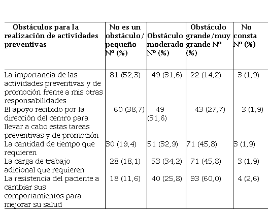 En cuanto a los obstáculos que en opinión de los residentes de MF y C existen para el desarrollo de las APPS, en la tabla 4 aparece la distribución de sus respuestas. La resistencia del paciente a cambiar sus comportamientos para mejorar la salud, junto con la cantidad de tiempo y la carga de trabajo adicional fueron considerados los mayores obstáculos para el desarrollo de las APPS.