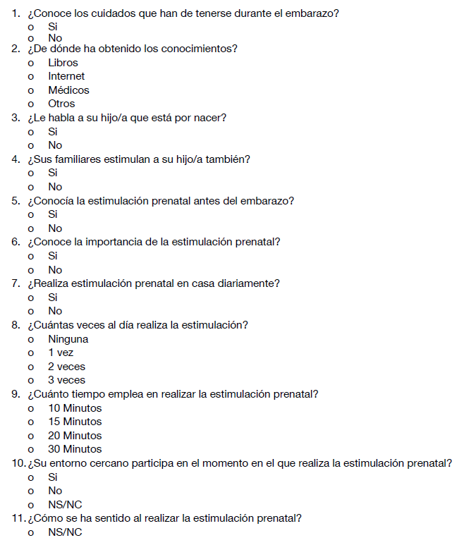 La primera parte del cuestionario recogía las sociodemográficas variables: edad, nacionalidad, estado civil, número de hijos, nivel sociocultural y la edad de gestación. La segunda parte estaba constituida por veintidós preguntas, tanto abiertas como de respuesta múltiple, relacionadas con el conocimiento de la estimulación prenatal, sus beneficios y su realización.