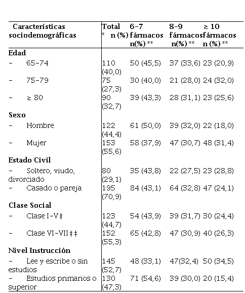 La edad media fue de 76,8 años (DE: 6,7) y un 55 % eran mujeres. En la tabla 1 se muestran las características sociodemográficas de los participantes en función del número de fármacos consumidos.