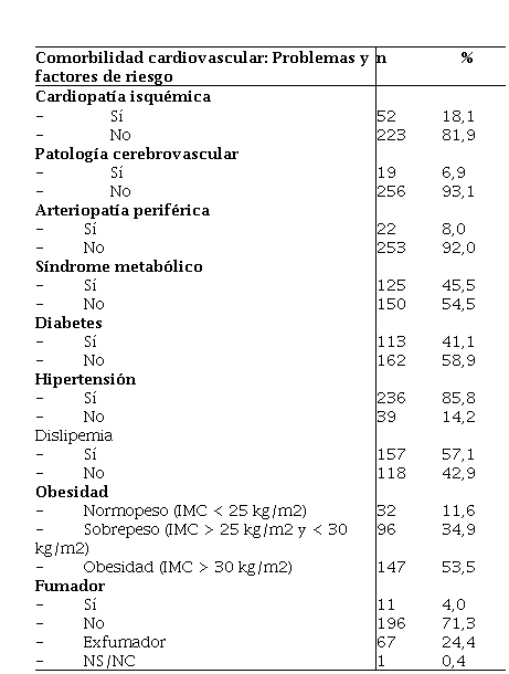 El 75,3 % (207) de los sujetos presentaba cinco o más problemas de salud y el 38,9 % (107) siete o más. Los problemas de salud más frecuentes, según la Clasificación Internacional de Atención Primaria (CIAP-2), fueron endocrinos (93,8 %), cardiocirculatorios (92,0 %), locomotores (57,8 %), respiratorios (25,8 %), digestivos (24,0 %) y psicológicos (22,5 %). Respecto a la patología cardiovascular, el factor de riesgo más frecuente fue la hipertensión (85,5 %) (tabla 2). Un 42,9 % de sujetos presentó un riesgo cardiovascular alto o muy alto (Score ≥ 5).