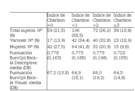 El 40 % de los participantes presentó un Índice de Charlson ≥2. En la tabla 3 se presenta la distribución de los participantes y puntuaciones de calidad de vida mediante ambas escalas EuroQol (descriptiva y visual) en función del valor del índice de Charlson.
