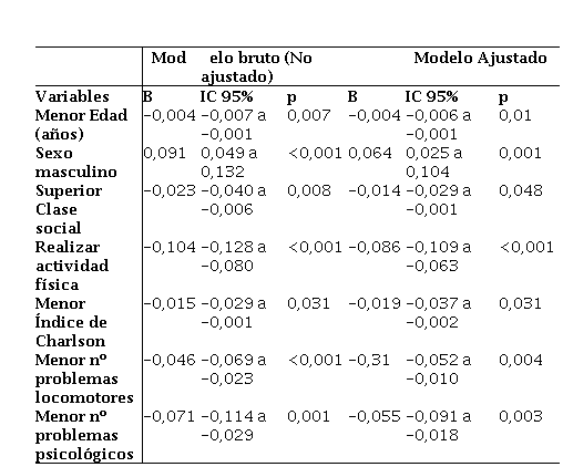 Como se muestra en la tabla 4, las variables asociadas, mediante análisis multivariante (regresión lineal múltiple), a una mayor calidad de vida (escala descriptivo) fueron: tener menor edad, sexo masculino, superior clase social, realizar actividad física, menor índice de Charlson y padecer menos problemas locomotores y psicológicos (p<0,05).