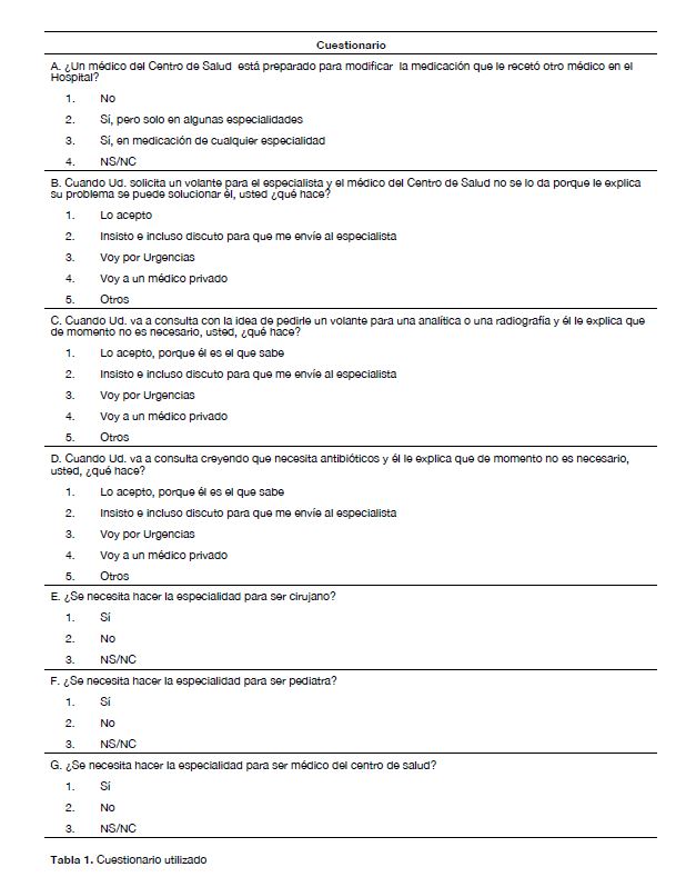 Main measures. Socio-demographic variables, health care service use indicators, knowledge about our speciality and attitudes towards potential conflicts were registered. A specific ques- tionnaire was designed and a letter was sent to the selected patients before telephone survey.