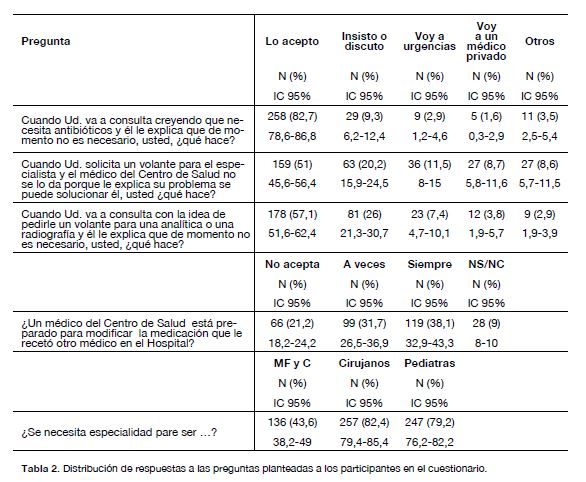 Results. 43.6 % (CI 95 %: 38.2-49) patients know that postgraduate specialised training is re- quired to become family doctor. 38 % (CI 95 %: 32.9-43.3) always agree with changes in medi- cation proposed by the Family Doctor. 51 % (CI 95 %: 45.6-56.4) would agree with their doctor's refusal of referral to hospital care. 57 % (CI 95 %: 51.6-62.4) would agree with a doctor's refusal to make a complementary test although the patient had requested it. 82.7 % (CI 95 %: 78.6- 86.8) would agree with not being prescribed antibiotics although the patient had requested it.