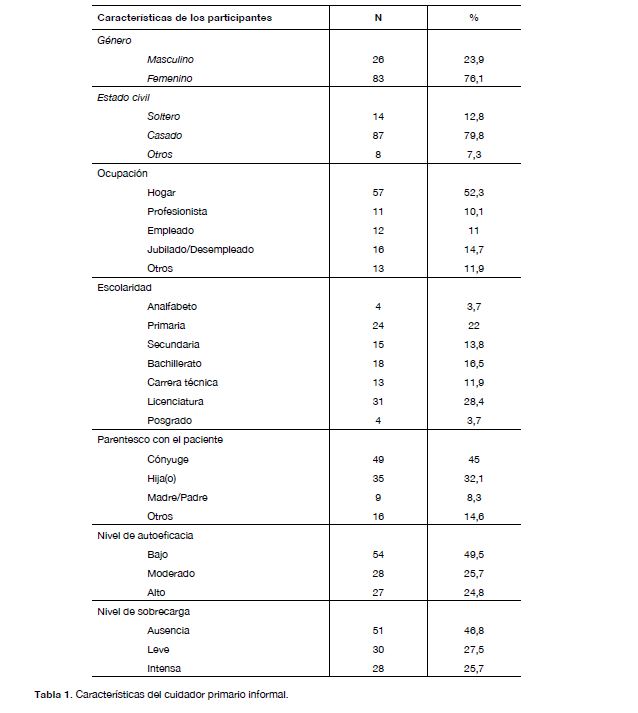 Al describir las características de los cuidadores primarios informales de nuestra muestra se observa un perfil similar al descrito en publicaciones previas, el cual corresponde a una mujer, con nivel educativo bajo, sin empleo y con un nivel socioeconómico bajo 26, 27, 28.