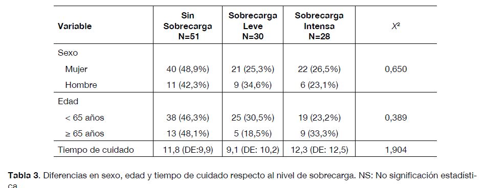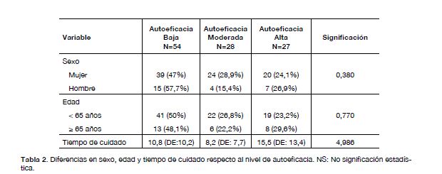 Mediante la prueba de chi-cuadrado y Kruskal-Wa- llis no se observaron diferencias estadísticamente significativas respecto a la distribución de sexo, rango de edad y tiempo de diagnóstico por nivel de sobrecarga y grado de autoeficacia, tal como se muestra en lastablas 2 y 3.