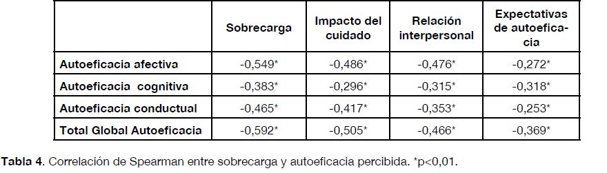 Resultados. El 49,5% (95%IC: 82,12-89,16) de la muestra reportó un nivel de autoeficaci abajo. El 27,5% (95%IC: 20,04-22,75) presentó sobrecarga leve y el 25,7% (95%IC: 37,71-47,78)sobrecarga intensa. Los resultados del análisis revelan una relación inversamente proporcional entre las variables del estudio (rs=-0,592, p<0,05), Eliminar lo siguiente: esto quiere decir que a mayor sobrecarga menor autoeficacia percibida y viceversa.