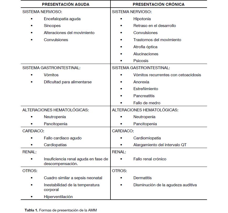 La clínica se presenta generalmente de dos formas 5(tabla 1), pero todos cursan con un periodo libre de enfermedad y muestran episodios de descompensación metabólica, que suelen asociarse a cuadros de infecciones o estrés. En la forma neonatal existe un periodo libre de síntomas que posteriormente comienza con un curso agudo y severo. La forma tardía comienza a partir del año de vida y puede ser, a su vez, aguda recurrente, intermitente (se exacerba por cuadros infecciosos, inmunización, cirugía, ayuno, trasgresión dietética, estrés), crónica progresiva o lentamente progresiva (los síntomas son desde insidiosos a asintomáticos). Queremos destacar los trastornos del movimiento que en fase tardía presentan una frecuencia de aparición de entre el 30-45 % 5.