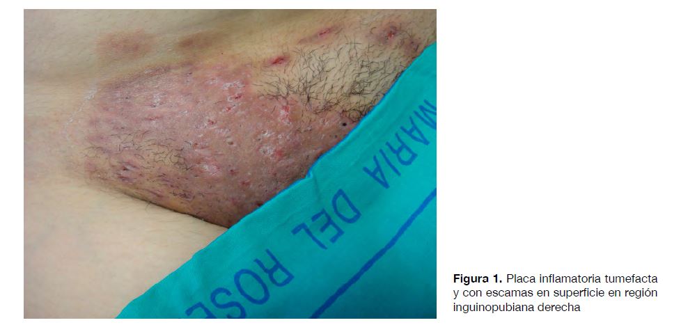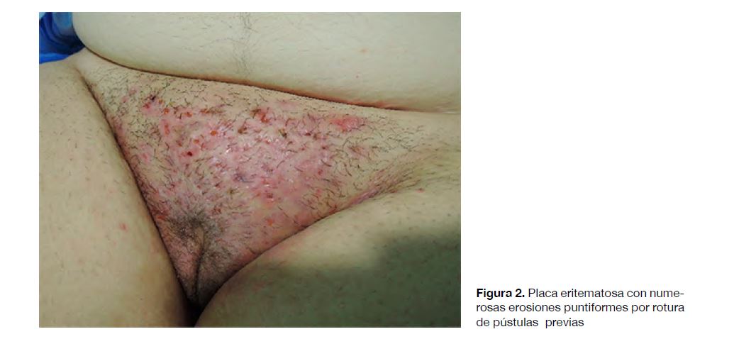 La presentación clínica consistió en una placa inflamatoria de crecimiento progresivo durante las semanas previas que posteriormente produjo una placa tuberosa purulenta y costrosa en monte de Venus y labios mayores (fig. 1 y 2), con importante dolor, así como lesiones satélites por muslos, nalgas y/o región periné en las tres pacientes, además de lesiones a distancia en una de ellas. Una de las pacientes desarrolló un eritema nodoso localizado en regiones pretibiales, confirmado mediante biopsia como reacción de hipersensibilidad a distancia, descrita en casos de tiña inflamatoria.