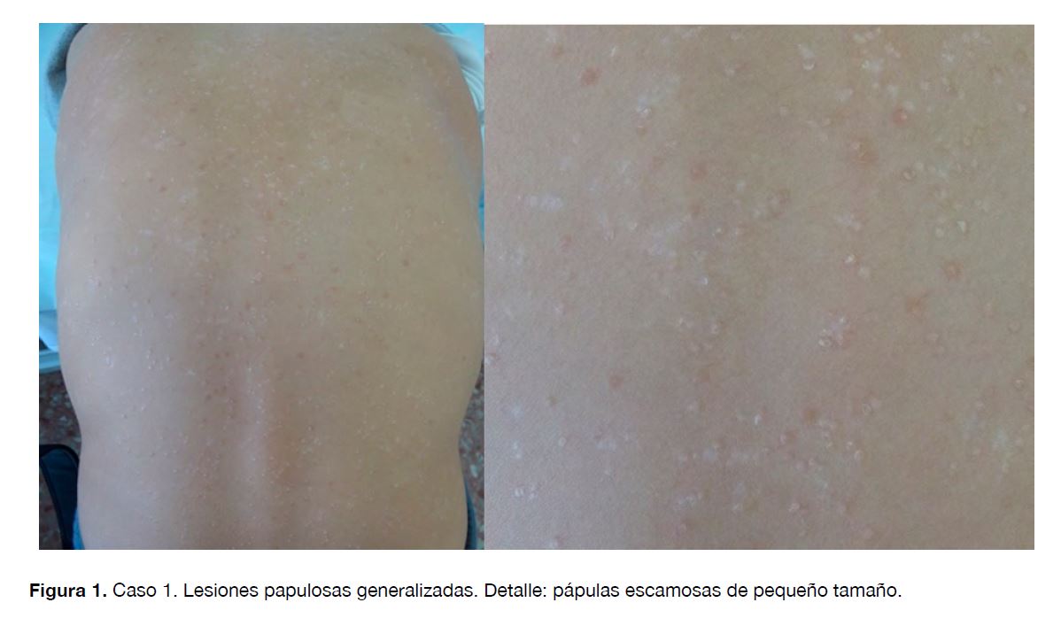 Se han descrito dos formas: una en adultos, más común en mujeres, con pápulas hiperqueratósicas que afectan a ambos muslos 2; y otra infrecuente forma infantil. Esta última, sin predominio por sexo, se manifiesta de manera asimétrica con lesiones foliculares en tronco, axilas o prominencias óseas o bien como una extendida erupción difusa parecida a la PRP.