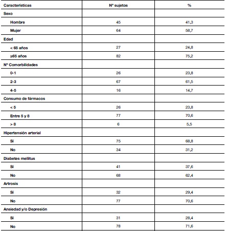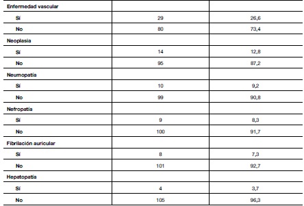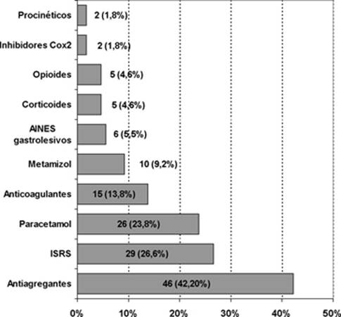 Los antecedentes de enfermedades crónicas se agruparon en las siguientes categorías: hipertensión arterial, diabetes mellitus, enfermedad vascular (enfermedad coronaria, arteriopatía periférica, enfermedad cerebrovascular, tromboembolismo pulmonar), fibrilación auricular, trastornos ansiosos y/o depresivos, hepatopatía (hepatopatía alcohólica, cirrosis), neumopatía (EPOC, insuficiencia respiratoria restrictiva), nefropatia (enfermedad renal crónica, transplante renal), neoplasia, osteoartrosis e inmunodeficiencia. Se recogió información sobre el consumo crónico de ISRS, paracetamol, opioides, procinéticos, antiagregantes, AINE, anticoagulantes y corticoides.