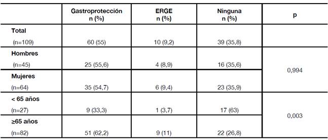 Teniendo en cuenta las patologías y tratamientos concomitantes de los sujetos de la muestra en el momento de la recogida de datos para el estudio, había indicación de gastroprotección en el 61,5 % (IC 95 %: 52,1 - 70,1) de ellos, observando una mayor proporción de indicación en el grupo de edad superior o igual a 65 años respecto a los de menos de 65 años (69,5 % vs 37 %; p=0,003), sin mostrar diferencias en función del sexo.