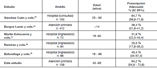 En la Tabla 3 se presentan los porcentajes de adecuación en la indicación de IBP obtenidos en la bibliografía consultada. El estudio de Sanchéz Cuén y cols.10 analiza la adecuación en la indicación del consumo crónico (toma diaria durante más de un año) de IBP en pacientes que acudieron a consulta externa en un hospital y muestra un porcentaje mucho mayor de indicaciones apropiadas por patología digestiva (48,3 %) que por gastroprotección (16,4 %), lo cual podría explicarse por la procedencia hospitalaria de la población estudiada. En 49,7 % de la muestra se indicó el IBP después de una endoscopia, resultando la indicación adecuada con más frecuencia en estos casos que en los que no se había realizado endoscopia previa. El estudio de Burgos Lunar y cols14 es el único realizado en Atención Primaria, pero analiza la utilización aguda y crónica de IBP. A pesar de no incluir únicamente sujetos con consumo crónico de IBP, hay mayor porcentaje de sujetos con indicación apropiada por gastroprotección (28,3 %) que por patología digestiva (8,1 %). Con respecto a los estudios realizados en ámbito hospitalario17-19 se ha comparado con la proporción de sujetos que tomaban IBP con indicación adecuada antes de ingresar en el hospital.