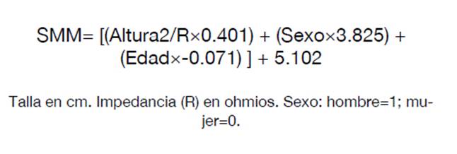 Para la valoración de sarcopenia se siguieron los criterios diagnósticos propuestos por el European Working Group on Sarcopenia in Older People (EWGSOP), que consisten en la demostración de pérdida de masa muscular, fuerza muscular y rendimiento muscular. El primero de ellos es condición imprescindible, junto a alguno de los otros dos21. La masa muscular esquelética (MME) se cuantificó mediante análisis de impedancia bioeléctrica (BIA), empleando un impedanciómetro Tanita® BC-420-S (Tanita Corporation, Japón), usando la ecuación predictiva de Janssen31: