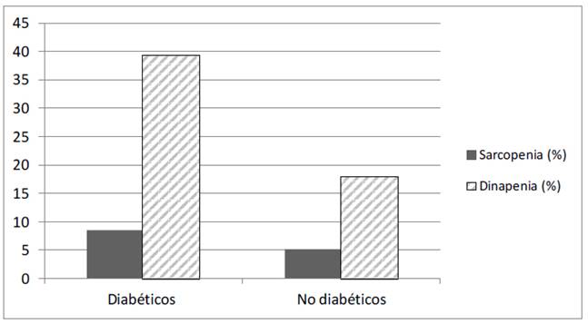 Resultados.: La prevalencia de sarcopenia en diabéticos fue del 8,5 %, frente al 5,2 % en no diabéticos (diferencia no significativa). En lo referente a dinapenia: 39,3 % en diabéticos y 18,0 % en no diabéticos (p<0,001). Resultaron asociadas tanto a sarcopenia como a dinapenia las variables: edad, comorbilidad elevada, retinopatía diabética, neuropatía periférica, velocidad de la marcha <1 m/s y no ser fumador en activo. La resistencia insulínica y el género femenino fueron estadísticamente significativas sólo para la sarcopenia. La cardiopatía isquémica, la insuficiencia cardíaca y el estado civil de soltero o viudo aparecieron asociadas únicamente a dinapenia. En el análisis multivariante para sarcopenia resultaron con significación estadística: edad, osteoporosis, retinopatía diabética, glaucoma y el test Beck Depression Inventory; en el correspondiente a dinapenia: edad, gonartrosis, anemia y velocidad de la marcha <1 m/s.