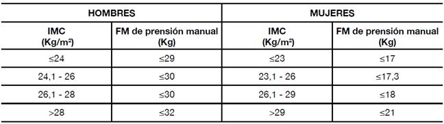 Posteriormente se calculó el índice de masa muscular (IMM), dividiendo la MME por el cuadrado de la talla (expresado en Kg/m2). Se determinó que existía pérdida de MME si el IMM era inferior a los puntos de corte obtenidos por Masanés en la población de Barcelona: 8,31 Kg/m2 en hombres y 6,68 Kg/m2 en mujeres32. La fuerza muscular (FM) de prensión manual se midió con un dinamómetro hidráulico de JAMAR®, modelo J00105 (Lafayette Instrument Company, EE.UU.), y se adoptaron los puntos de corte basados en el Cardiovascular Health Study33, recomendados por el EWGSOP (Tabla 1). Para el rendimiento muscular se empleó el test de la velocidad de la marcha en una distancia de 6 metros, tomando el valor más rápido de dos repeticiones. Se consideró que era anormal si dicha velocidad resultaba inferior a 0,8 m/s.