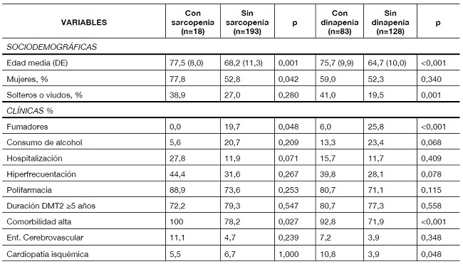 La edad media fue significativamente mayor tanto en los sujetos con sarcopenia (p=0,001) como en aquellos con dinapenia (p<0,001). Ambos síndromes fueron más frecuentes en mujeres, especialmente la sarcopenia (77,8 %), de manera que sólo en ésta la diferencia de género resultó estadísticamente significativa (p<0,05). El estado civil de soltero o viudo apareció en el 41,0 % de los diabéticos con dinapenia, frente al 19,5 % en quienes no la presentaban (p=0,001).