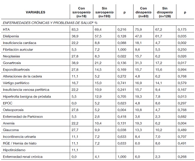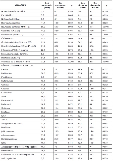 El análisis bivariante mostró un reducido número de variables clínicas que se asociaron de forma significativa tanto con sarcopenia como con dinapenia: comorbilidad elevada, retinopatía diabética, neuropatía periférica, depresión y no ser fumador en activo. Este hábito tóxico fue menos frecuente en pacientes con dinapenia. La velocidad de la marcha, admitiendo como punto de corte 1 m/s, mayor que el propuesto en la definición de sarcopenia, fue otra variable que resultó ser menor en presencia tanto de sarcopenia como de dinapenia (p<0,001 en ambos casos). La resistencia insulínica se asoció significativamente sólo a sarcopenia. La dinapenia mostró relación con la presencia de cardiopatía isquémica e insuficiencia cardíaca entre las enfermedades crónicas diagnosticadas. Ningún fármaco del tratamiento resultó significativo tras aplicar la corrección de Bonferroni.