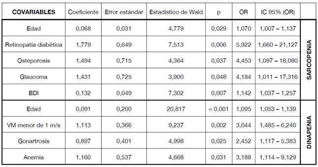 Mediante regresión logística binaria se construyó un modelo de predicción, de forma separada para sarcopenia y dinapenia, a partir de las variables que resultaron significativas en el análisis bivariante para cada caso (Tabla 3). En el modelo de sarcopenia permanecieron en la ecuación: edad, osteoporosis, retinopatía diabética, glaucoma y resultado del BDI. El correspondiente a dinapenia mostró significación para las covariables: edad, gonartrosis, velocidad de la marcha elevada y anemia.