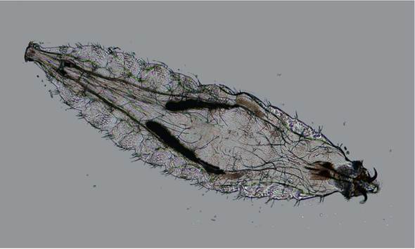 Bajo el microscopio, los huevos son amarillos con forma de grano de arroz, y eclosionan a larva entre 12 y 24 horas tras su puesta. Estas nuevas larvas maduran, anidan y proliferan volviéndose sexualmente activas a las 48 horas, siendo su vida media de menos de una semana.