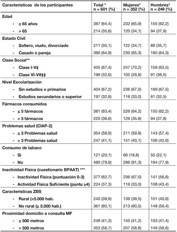 Fueron entrevistados 601 sujetos con una edad media de 57,6 años (DE: 18,3). En la tabla 1 presentamos las características de los participantes en función del sexo.