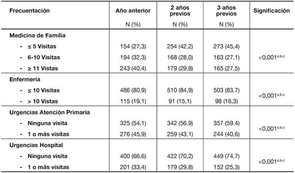 Methods: Multicentre, observational, descriptive study carried out in 601 adults who used the family medicine services of four Basic Health Zones in three Health Areas. The main variable was the frequency of visits to family medicine practices in the last year. Other variables were sociodemographic characteristics, health problems (CIAP-2 classification), drug use, quality of life (EuroQol-questionnaire), Health Area characteristics, and visits to medicine, nursing and emergency services within the previous three years.