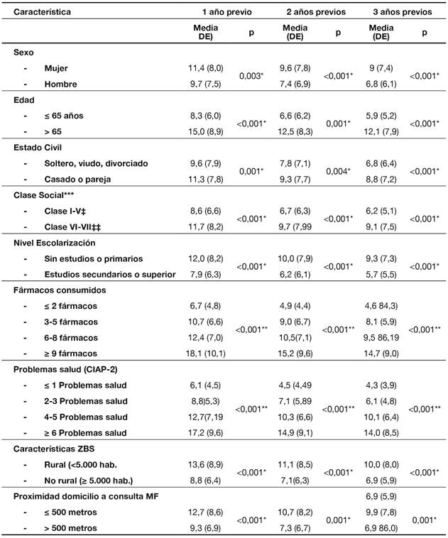 Results: The average number of visits to the family doctor was significantly higher in the previous year (10.7±7.8) than in the previous two (8.7±7.5) and three (8.1±7.0) years (p<0.001). Multiple linear regression showed variables associated with greater frequency of visits to the family doctor during the previous year: female sex (B:-1.858; 95 % CI, -2.743 — -0.974), reside in rural areas (B:-2.936 95 % CI, -3.914 — -1.959), more visits to Primary Care Emergency Room (B:0.342 95 % CI, 0.127 — 0.556), more visits to Hospital Emergency Room (B:1.106; 95 % CI, 0774 — 1.439), use higher number of drugs (B:0.531; 95 % CI, 0.384 — 0.679), lower EuroQol scale score (B:-0.052; 95 % CI, -0.069 — -0.034), more visits to nursing clinics (B:0.235; 95 % CI, 0.180 — 0.291) and presenting nervous system disease (B:1.639; 95 % CI, 0.380 — 2.898), respiratory disease (B:1.298; 95 % CI, 0.129 — 2.467) and anxiety (B:1.263; 95 % CI, 0.062 — 2.463).