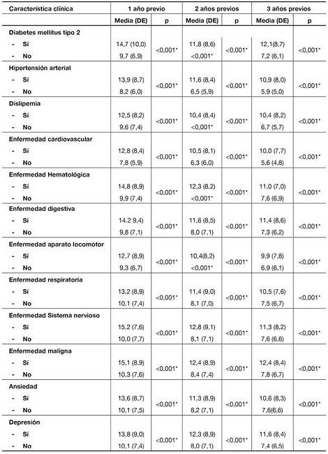 En cuanto a la morbilidad (tabla 4), el número medio de visitas fue significativamente superior en sujetos con enfermedad cardiovascular, hematológica, digestiva, del aparato locomotor, del sistema nervioso, respiratoria, maligna, depresión, ansiedad, dislipemia, hipertensión arterial y diabetes (p<0,001).