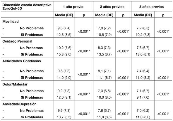 Respecto a la calidad de vida determinada mediante la escala descriptiva EuroQol, las dimensiones en las que mayor proporción de sujetos presentaron problemas fueron dolor/malestar (52,2 %), movilidad (30,6 %) y ansiedad/depresión (26,8 %). La puntuación media de CV mediante el cuestionario descriptivo EuroQol-5D (escala 0-1) fue 0,795 (DE: 0,178). El valor medio de la escala visual EuroQol-EVA (escala 0-100) fue 56,3 (DE: 28,7). Al comparar los sujetos que presentaban algún problema en cada dimensión de la escala descriptiva EuroQol-5D respecto a los que no lo tenían, se observó que en todas las dimensiones el número medio de visitas fue significativamente superior en los primeros tanto durante el último año como en los dos y tres anteriores (Tabla 5). Al analizar las dimensiones de la escala descriptiva EuroQol-5D con sus tres categorías, existió un incremento estadísticamente significativo de la frecuentación durante los tres años estudiados a medida que aumentaba el grado de problemas en las cinco dimensiones de esa escala (p<0,001).