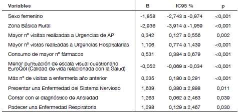 En la tabla 6 mostramos las variables asociadas, mediante análisis multivariante (regresión lineal múltiple), a una mayor frecuentación a consultas de MF durante último año fueron: sexo femenino (B:-1,858; IC95 %:-2,743 a -0,974), pertenecer a ZBS rural (B:-2,936; IC95 %:-3,914 a -1,959), más visitas realizadas a Urgencias de AP (B:0,342; IC95 %:0,127 a 0,556), más visitas a Urgencias Hospitalarias (B:1,106; IC95 %:0774 a 1,439), consumir mayor número fármacos (B:0,531; IC95 %:0,384 a 0,679), menor puntuación escala visual de EuroQol (CV) (B:-0,052; IC95 %:-0,069 a -0,034), mayor nº visitas enfermería (B:0,235; IC95 %:0,180 a 0,291), presentar patología sistema nervioso (B:1,639; IC95 %: 0,380 a 2,898), patología respiratoria (B:1,298; IC95 %: 0,129 a 2,467) y ansiedad (B:1,263; IC95 %:0,062 a 2,463). Se realizó ajuste considerando las variables que resultaron significativas en el análisis bivariante y las consideradas como posibles factores de confusión como edad y sexo.