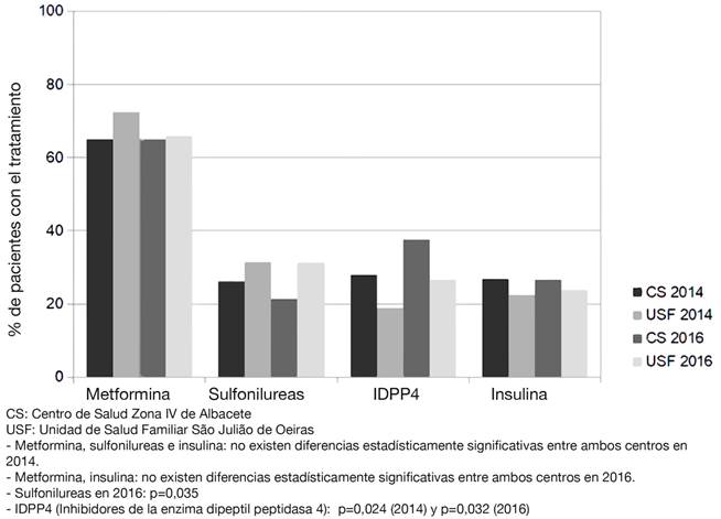 En cuanto a la prescripción de Metformina, Insulina o Sulfonilureas no había diferencias entre ambos centros en 2014, sin embargo, el uso de IDDP-4 alcanzaba el 28 % en Albacete vs 19 % en Oeiras, con diferencias estadísticamente significativas. También en el año 2016, existía una significativamente mayor prescripción de IDPP-4 en la ciudad española. Por otra parte, los inhibidores del cotransportador de Na/glucosa tipo 2 (SGLT-2) y las Metiglinidas solo habían sido usados en el Centro de Salud de Albacete en 2016, siguiendo las recomendaciones actualizadas por algunas guías como la Asociación Canadiense de DM de 20168. En cualquier caso hemos de tener en cuenta que en las fechas de realización del estudio se estaba produciendo la introducción de estos fármacos en nuestro arsenal terapéutico, de forma que en esos momentos su uso no estaba muy extendido.