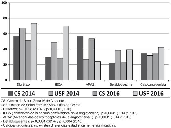 Estaban diagnosticados de HTA 110 pacientes portugueses y 203 españoles, lo que supone una proporción del 81 % para ambos grupos. Como puede verse en la figura 2, se mantiene un perfil de prescripción distinto en ambos centros.